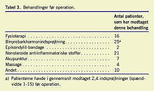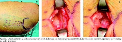 Operativ behandling: Metoderne inkluderer bl.a.: 1) overskæring af extensor aponeurose ved laterale epikondyl (som ved vores patienter), 2) operativ denervering af laterale epikondyl, 3) flere forskellige intraartikulære procedurer som f.eks. partiel/total spaltning af det annulare ligament, syno-vectomi m.m., 4) løsning af n. interosseus posterior i den ra-diale tunnel og spaltning af Frohses arkade [7].
