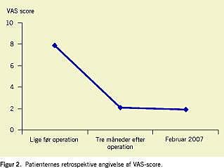 VAS-score lige før operation, tre måneder postoperativt og i marts 2007.