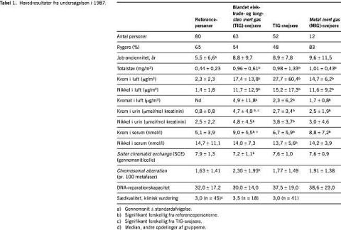 I alt 226 mænd deltog i 1987 i en undersøgelse af rustfrit stål-svejseres belastning med bl.a. krom og nikkel [1]. Der blev målt udsættelser i indåndingsluften, og blod og urin blev også undersøgt. Som mål for tidlig skadelig effekt blev der blandt andet undersøgt for kromosomskader i hvide blodceller. Resultaterne viste klare forskelle på belastningen i indåndingsluft, urin og blod hos svejsere og referencepersoner uden svejsearbejde, og der var også højere belastning ved elektrodesvejsning end ved tungsten inert gas (TIG)-svejsning. Specielt var det bemærkelsesværdigt, at antallet af kromosomskader, målt ved analyser for kromosomaberrationer var forhøjet hos elektrodesvejsere, hvorimod et andet mål for kromosomskader, søster-kromatid-udvekslinger var lavere hos de eksponerede. Se Tabel 1 fra [1], med data fra de 207 undersøgelsespersoner, der i 1987 havde entydig eksponering de forudgående 6 mdr. som henholdsvis kontrolpersoner og svejsere. I en nærmere opfølgning i et ph.d.-studium [2] af DNA-skader og DNA-reparation pegede man på en sammenhæng mellem lavere sister chromatid exchange (SCE) og en ændret fordeling i B- og T-lymfocytter ved belastende svejsearbejde.