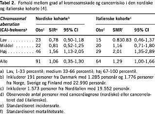 Den danske undersøgelses resultater indgik senere i nordiske og europæiske studier [3, 4], som viste, at et forhøjet antal af kromosomaberrationer i de hvide blodceller er forbundet med en øget kræftrisiko. Dette er fundet i to kohorter fra henholdsvis Norden og Italien (Tabel 2 ).