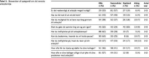 Det nuværende/seneste arbejdsmiljø blev kortlagt gennem en række spørgsmål, der er angivet i Tabel 3 . Spørgsmål om, hvor tilfreds man var med måden ens evner blev brugt på, viste, at 25 (18%) var yderst tilfredse, 102 (72%) var tilfredse og 14 (10%) var utilfredse, mens en var meget utilfreds.