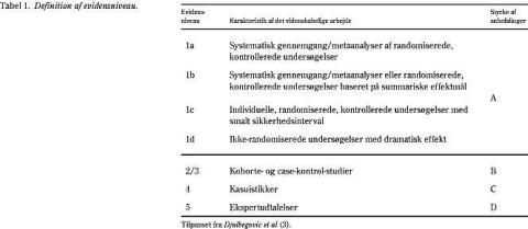 På basis af en gennemgang af litteraturen er det ønsket med denne oversigt at 1) belyse formålet med postoperativ opfølgning, 2) vurdere hvilke rutineundersøgelser det er rimeligt at udføre, og 3) vurdere hvor hyppigt kontrollerne bør foretages. Evidensniveau er vurderet i henhold til accepterede retningslinjer (Tabel 1 ) (3).