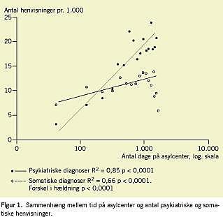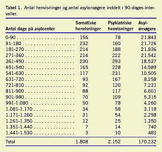 Medicinsk personale på asylcentre har hævdet, at lange opholds-tider på asylcentre er årsag til eller forværrer psykisk sygdom. Vi brugte et større materiale fra Dansk Røde Kors' asylcentre (årene 2001-2002) vedr. ansøgninger til Udlændingeservice om behandling hos speciallæge til at undersøge, om incidensen af psykisk sygdom stiger med opholdstiden i asylcentrene. Ansøgninger om behandling af psykisk sygdom steg med opholdstiden i centrene i alle de undersøgte kategorier af psykisk sygdom og for hovedparten af nationaliteterne.