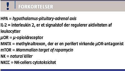 Opioider påvirker store dele af immunsystemet ved blandt andet at nedregulere genekspressionen af de proinflammatoriske processer i leukocytter [6]. Samtidig øger de apoptosen af T-celler og makrofager. Transkriptionen af T-cellens vigtige vækstfaktor interleukin (IL)-2 samt flere andre af dennes transkriptionsfaktorer hæmmes af morfin og β-endorfin [3, 7]. Visse af disse effekter kan hæmmes af en μOR-anta-gonist, andre kan ikke, hvilket tyder på, at effekterne kun delvist medieres via μOR. Det er endvidere påvist, at replikationen af humant immundefekt-virus-1 (HIV-1) bliver øget, en effekt, der medieres gennem μOR[8].