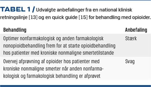 I 2019 udgav Sundhedsstyrelsen en national klinisk retningslinje (NKR) for opioidbehandling af kroniske nonmaligne smerter [13] (Tabel 1) og i samarbejde med Danske Regioner en ny smerteguide [14]. I begge peges der på, at der skal tages individuelle hensyn, og at opioidbehandling kan anvendes til de undergrupper af patienter med smerter, hvor det er relevant. Dette i anerkendelsen af at nogle patientgrupper har behov for og gavn af opioidbehandling. Denne udvikling ses som et vigtigt skridt i retning mod en mere nuanceret tilgang til behandlingen af kroniske nonmaligne smerter. Det er vigtigt, at denne tilgang til opioidbehandling formidles videre til klinisk praksis; behandling med opioider kan hos nogle patienter være den eneste mulighed for at opnå tilstrækkelig smertelindring, og disse patienter bør ikke forholdes denne behandlingsmulighed [9].
