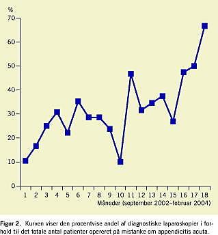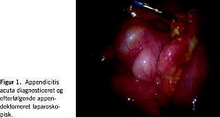 Laparoskopisk kirurgi har vist sig at medføre nedsat inflammatorisk stressrespons, kortere hospitalisering og forbedret rekonvalescens i forhold til konventionel kirurgi. Laparoskopien vinder derfor frem ved flere og flere kirurgiske tilstande [1]. Alle kirurger bør beherske laparoskopisk teknik [2, 3]. Kirurgisk oplæring har været baseret på mesterlære, hvor den åbne apppendektomi (ÅA) har været anvendt som oplæringsoperation. Den diagnostiske laparoskopi (DL) har været foreslået som oplæringsoperation i basal laparoskopisk teknik [3, 4]. DL er bl.a. relevant ved mistanke om appendicitis acuta, idet den kliniske diagnose appendicitis er ret upålidelig, således findes kun korrekt diagnose hos ca. 70%. Med afsæt i ovenstående ønskede vi på Kirurgisk Gastroenterologisk Afdeling D, Amtssygehuset i Glostrup, at indføre DL ved klinisk mistanke om appendicitis acuta og at foretage laparoskopisk appendektomi (LA) ved peroperative tegn på appendicitis (Figur 1).
