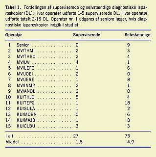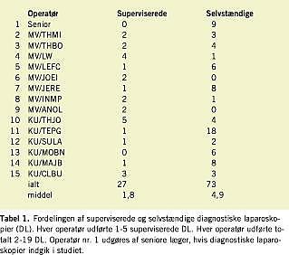 Diskussion: Der var en kort indlæringstid for DL. Kirurgerne var gode til at stille diagnoser laparoskopisk. Supervisionen blev primært varetaget af seniore læger. DL kan bruges som oplæringsoperation i basal laparoskopisk teknik.