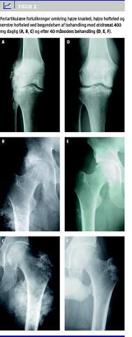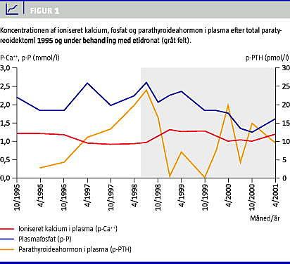 En dansk mand, der var født i 1965, med kronisk nyresvigt (CKD) på grund af ekstrakapillær glomerulonefritis blev hæmodialyseret i perioderne 1984-1987 og 1989-2001. I mellemtiden havde patienten et fungerende nyregraft. I 1993 blev der registreret ekstraskeletale forkalkninger omkring ankler, knæ, hofter, skuldre og albuer, og de var ledsaget af svære smerter og nedsat bevægelighed af leddene. Knoglebiopsi fra 1994 viste renal osteodystrofi med hyperparatyroide læsioner uden tegn på defekt mineralisering eller aluminiumosteomalaci. I 1995 blev der foretaget total paratyroidektomi. Præoperativt var plasma-parathyroideahormon (p-PTH) 14-23 pmol/l, plasmafosfat (p-P) 2,10-2,90 mmol/l og ioniseret kalcium (p-Ca++) 1,25-1,30 mmol/l under behandling med fosfatfattig diæt, alfacalcidol, fosfatbinder og lav-kalciumkoncentration i dialysevæsken (1,25 mmol/l). PTH faldt efter paratyroidektomien, men steg efterfølgende til det præoperative niveau (Figur 1 ). Fra 1995 til 1998 gennemgik patienten 15 operationer med ekstirpation af forkalkningerne omkring knæ, hofter, skuldre og albuer. Pga. gentagne recidiver og postoperative komplikationer forsøgte man behandling med etidronat 400 mg daglig fra maj 1998. Behandlingen fortsatte uafbrudt i 42 måneder. Figur 1 viser, at p-P faldt gradvist under behandlingen. P-Ca++ steg forbigående, og i samme periode faldt p-PTH svarende til en forbigående øgning i dosis af alfacalcidol. Leddene blev røntgenundersøgt før start og derefter jævnligt under behandlingen (Figur 2 ). Efter tre måneder var forkalkningerne aftagende, og efter 36 måneder resterede kun mindre forkalkninger omkring hofterne. Symptomerne var på det tidspunkt helt forsvundet. Der blev ikke registreret bivirkninger af behandlingen. I december 2001 blev patienten nyretransplanteret, og behandlingen med etidronat ophørte. Graftens funktion har efterfølgende været stabil, og kalcifikationerne er ikke recidiveret.