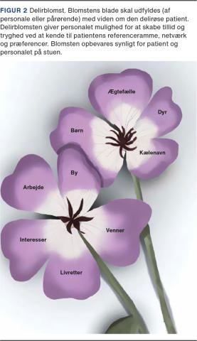 Det tværfaglige team skal iværksætte nonfarmakologiske indsatser, primært i form af grundlæggende sygepleje med fokus på hydrering og ernæring, sikring af udskillelse af afføring og urin, forebyggelse af smerter, lejring, mobilisering samt skærmning. Der bør være fokus på at sikre nødvendig søvn og hvile, og vanlig døgnrytme skal tilstræbes. Søvn-/uroskema skal føres hos alle delirøse, og et vigtigt behandlingsmål er, at den delirøse får flere timers sammenhængende søvn om natten. Støttende og reorienterende kommunikation, »du har lungebetændelse/du er på hospitalet/vi passer på dig«,skal være kort og præcis og tålmodigt gentages. Aktiv inddragelse og grundig information af pårørende tilrådes, både mundtligt og med skriftligt materiale. De pårørende opmuntres til at være til stede og kan medbringe kendte objekter og billeder. En deliriumblomst kan anvendes til pårørendes inddragelse (Figur 2).