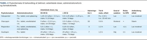 Haloperidol er førstevalg og kan gives som tablet, oral opløsning eller intramuskulært. Hos ældre over 80 år bør den samlede døgndosis som hovedregel ikke overstige 5 mg. Man kan med fordel give fast 1,25-2,5 mg til aftenen og supplere med 1,25 mg ved behov. Dosering, administrationsform og farmakokinetik findes i Tabel 2. Den sparsomme evidens på området afspejler sig i, at der i Danmark er betydelig regionale forskelle i valg af antipsykotika til behandling ved delirium, og det tilrådes, at man orienterer sig i egne vejledninger på området.
