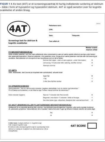 Sundhedspersonale overser delirium hos op mod to tredjedele af patienterne [11].Sundhedsstyrelsen angiver det derfor som god klinisk praksis at screene risikopatienter gentagne gange for delirium [8]. Også i internationale retningslinjer anbefales screening [12]. De mest anvendte psykometriske test er b-CAM [13] (frit tilgængelig på SST’s hjemmeside) eller 4AT [14] (Figur 1).