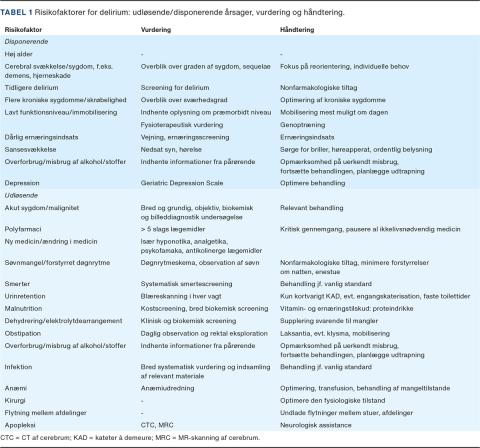 Lægens opgave er at identificere patienter, som er i høj risiko for at have eller få delirium (Tabel 1), erkende delirium, udrede og behandle de udløsende årsager samtidig med at sikre fokus på somatisk stabilitet. Anamnesen skal suppleres fra patientens netværk, og der bør særligt være fokus på hændelser eller ændringer i tiden op til indlæggelsen, såsom fald, smerter, tegn til infektion, problemer med udskillelser af afføring og urin, svigtende føde/væskeindtag og/eller medicinændringer. Udredningen af delirium fordrer systematisk og grundig objektiv undersøgelse samt bred paraklinisk udredning, herunder relevante billeddiagnostiske og mikrobiologiske undersøgelser.