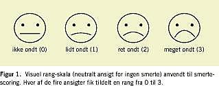 Børnene angav deres smerteoplevelse på en visuel rang-skala, som de tidligere var blevet præsenteret for af anæstesisygeplejersken. Skalaen havde fire ansigter (Figur 1), hvor første ansigt var neutralt [7, 8]. Kun ændring i mundens udseende udtrykte tiltagende smerte ved stikket. For at sikr e at barnets smertescore skyldtes nålestikket og ikke frygten for stik, pegede anæstesisygeplejersken efter kanyleringen, men før spørgsmålet om smertescore på det første neutrale ansigt og forklarede, at dette var et barn, der var bange for at blive stukket, men hvor stikket ikke havde gjort ondt. Herefter blev barnet bedt om at indkredse det ansigt, som bedst udtrykte, hvor ondt stikket gjorde.