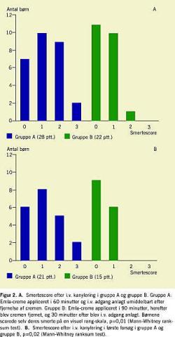 Smertescore i gruppe B var statistisk signifikant lavere end i gruppe A (p=0,01). I gruppe A og B, hhv. scorede 25% vs. 50% »ikke ondt«, 36% vs. 45% »lidt ondt«, 32% vs. 5% »ret ondt« og 7% vs. 0 »meget ondt« (Figur 2A ). Hvis »ikke ondt« og »lidt ondt« betragtes som acceptabel analgesi, havde således 61% i A og 95% i B acceptabel analgesi. For i.v. adgang anlagt i første forsøg (formentlig mindre bias pga. mindre angst) fandtes tilsvarende i gruppe A (21 patienter) og gruppe B (15 patienter), at hhv. 29% vs. 60% scorede »ikke ondt«, 38% vs. 40% »lidt ondt«, 24% vs. 0 »ret ondt« og 9% vs. 0 »meget ondt« (p=0,02) (Figur 2B) svarende til, at 67% af børnene i gruppe A, der fik i.v. anlagt i første forsøg, havde acceptabel analgesi med en smertescore på 0 eller 1, mens det gjaldt for 100% i gruppe B.