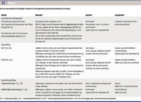 Der findes overordnet tre forskellige metoder til vurdering af tarmens perfusion intraoperativt (Tabel 1). Ingen af disse metoder er os bekendt implementeret som standardprocedure.