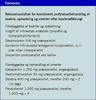 Den kirurgiske håndtering af brystkræftpatienter er veldokumenteret og stringent i henhold til nationale retningslinjer. Derimod er principperne for behandling af postoperativ kvalme, opkastninger og smerter præget af mangel på entydig procedurespecifik evidens.