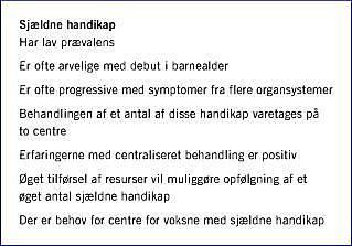 Efter et interview med daværende sundhedsminister Torben Lund i Elevat2ren satte Sundhedsstyrelsen i 1990'erne et udvalgsarbejde i gang, der med redegørelsen »Sjældne handicap - den fremtidige tilrettelæggelse af indsatsen i sundhedsvæsenet« udlagde en række principper for organisation af behandlingen af sjældne handikap [1]. På baggrund af en gennemgang af 11 handikap af den relativt hyppige type (neurofibromatose type 1, osteogenesis imperfecta, Marfans syndrom, galaktosæmi, Ehlers-Danlos' syndrom, myelomeningocele, blæreekstrofi, Wilsons sygdom, Prader-Willis syndrom, Spielmeyer-Vogts sygdom og Aperts syndrom) konkluderede man i redegørelsen, at en fagligt kvalificeret og hensigtsmæssig behandling af sjældne handikap fordrer en samling af sundhedsydelserne. For at opnå tilstrækkelig viden, rutine og erfaring anbefalede man at have to centre for sjældne handikap, et på Rigshospitalet og et på Skejby Sygehus. På centrene skulle man koordinere den højtspecialiserede behandling og kontrol, udarbejde behandlingsprotokoller og databaser samt iværksætte forskning. Centrenes formål var også at give konstruktiv vejledning til samarbejdspartnere i patientens lokalområde; udvide samarbejdet med andre centre for sjældne sygdomme, f.eks. Statens Øjenklinik, og forbedre koordinationen af den sociale og socialpædagogiske indsats og andre muligheder, der udspringer af centrenes specialviden om sjældne sygdomme. Man understregede nødvendigheden af et gensidigt forpligtende samarbejde mellem centerfunktionen og patienternes lokalsygehus, og i redegørelsen blev der givet konkrete forslag til behandlingsprotokoller for de 11 handikap. Redegørelsen var velbegrundet med et højt ambi-tionsniveau for centrenes funktion, både lægelig behandling, plejemæssige funktioner og forskning. De 11 handikap skulle være modeller for andre sjældne handikap, hvor man har behov for multidisciplinær indsats, og selv om redegørelsen hverken rummede en strategi for at tilføre centrene de nødvendige resurser eller for at udvide centerfunktionen for patienter med andre sjældne handikap, er mange af redegørelsens hensigter blevet realiseret med gode resultater. Således er andre sygdomme end de i redegørelsen nævnte blevet centraliseret efter Sundhedsstyrelsens retningslinjer for spe-cialeplanlægning og lands-landsdelsfunktioner, f.eks. arvelige stofskiftesygdomme til H:S Rigshospitalet.
