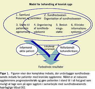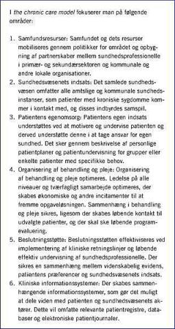 Formålet med denne artikel er at beskrive CCM, der angiver den samlede indsats, der er behov for ved kroniske sygdomme. Den omfatter indsatsen fra både samfundet og sundhedsvæsenet samt patientens aktive indsats for at sikre det mest optimale forløb for de kroniske sygdommene. Modellen kan danne grundlag for inspiration og nytænkning vedrørende planlægning og implementering af en optimeret sundhedsfaglig indsats omkring kroniske sygdomme i det danske sundhedsvæsen.