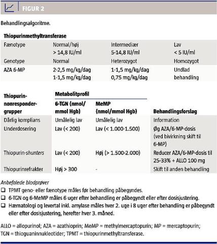 Baseret på data fra litteraturen og egne erfaringer foreslås hermed en algoritme for behandling med thiopuriner ved kronisk inflammatorisk tarmsygdom. Der er baseret på måling af TPMT angivet dosisanbefalinger ved påbegyndelse af behandlingen og efterfølgende dosisjusteringer baseret på måling af metabolitter (6-TGN og MeMP) (Figur 2).
