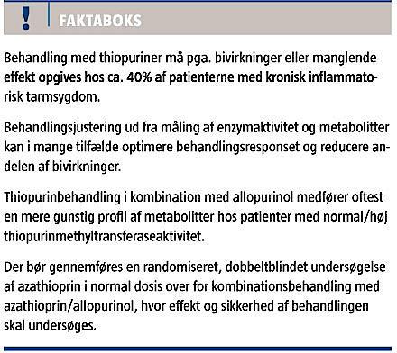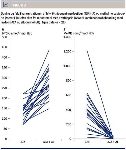 Ved kombinationsbehandling, hvor thiopurindosis er reduceret til 25-50% af rekommanderet dosis, givet sammen med 100 mg allopurinol dagligt, opnår man en stigning af den aktive metabolit 6-TGN og et betydeligt fald i den toksiske metabolit MeMP (Figur 3). I langt de fleste tilfælde tåles behandlingen godt. De beskrevne bivirkninger hos ca. 10% af patienterne, omfattende hududslæt, leverpåvirkning, let leukopeni og øvre dyspepsi, var alle milde og reversible efter reduktion af dosis eller ophør af behandlingen [9-13].