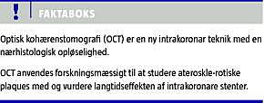 Optisk kohærenstomografi (OCT) er en ny intrakoronar teknik, som benytter infrarødt lys til at fremstille todimensionelle billeder af koronararterierne. Med baggrund i en ultrahøj opløselighed på 10-20 mikrometer omtales OCT ofte som en optisk biopsi, og foreløbige studier har netop vist god korrelation med histologi blandt andet til at fremstille arterievæggens trilaminære struktur, visualisere fibrøse, fibrokalcificerede og lipidrige områder samt makrofagstrøg i aterosklerotiske plaques. Inter- og intraobservatørvariationen er lille. En fordel ved OCT ifht. IVUS er, at kalcificerede områder ikke danner slagskygge, hvilket giver mulighed for at undersøge karvæggen bag en kalcifikation [5, 6]. Da karvæggens struktur kan studeres på et nærhistologisk niveau in vivo, er metoden anvendelig inden for flere områder af den interventionelle kardiologi.