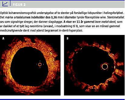 Medicinafgivende stenter hæmmer dannelsen af neointima (arvæv) og nedsætter dermed raten af behandlingskrævende restenose sammenlignet med konventionelle metalstenter [9]. Patofysiologisk betyder dette en forsinket stentheling. Sammen med en række andre faktorer disponerer den manglende indheling af medicinafgivende stenter for sen stenttrombose (trombose > 30 dage efter PCI) [8; 10]. Da OCT kan detektere meget tynde lag neointima, forventes metoden at spille en vigtig rolle i vurderingen af langtidssikkerheden af især medicinafgivende stenter, samt medvirke til at øge vores viden omkring stenttrombose [11]. OCT gør det således muligt at vurdere, hvornår en stent er færdighelet og dermed finde det ideelle tidspunkt for at seponere trombocythæmmende behandling med clopidogrel, som gives for at nedsætte risikoen for sen stenttrombose. Seponering af unødvendig trombocythæmmende behandling er vigtig, idet risikoen for blødning mindskes. Figur 2A og B viser to stenter på forskellige tidspunkter i helingsforløbet.