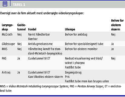 Stigende krav til øget patientsikkerhed i forbindelse med intubation samt tiltagende fokus på oplæring af yngre anæstesiologer og anæstesisygeplejersker i forbindelse med intubationsteknik har afstedkommet, at fiberoptisk og videoassisteret intubation har vundet indpas i den kliniske hverdag [3]. Udviklingen af fiberoptisk og videoassisteret apparatur med henblik på at visualisere glottis og dermed optimere intubationsteknikken har været omfattende siden 1990 [5]. Kun få af disse apparater bruges i klinisk praksis [3]. I det følgende fokuseres på nogle af de mest omtalte og anvendte videolaryngoskoper på markedet (Tabel 1 ). Intubationsteknikken varierer afhængig af apparaturets opbygning, hvorfor dette beskrives separat for McGrath Series 5 -videolaryngoskop.