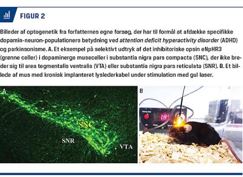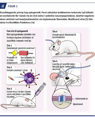 Optogenetik er et nyt teknologisk værktøj [1, 2], der gør det muligt at kontrollere bestemte celletyper i specifikke hjerneregioner in vivo (Figur 1). Metoden har revolutioneret hjerneforskningen inden for de seneste år og afdækket central ny viden inden for centralnervesystemets funktion og patofysiologi. Optogenetik virker ved hjælp af lysfølsomme ionkanaler eller ionpumper, kaldet opsiner, der udtrykkes i de neuroner, man vil manipulere. Når opsinerne aktiveres, hæves eller sænkes neuronernes membranpotentiale, og dermed hhv. aktiveres eller hæmmes deres fyring [4]. Opsiner blev oprindelig isoleret fra alger, der bruger disse lysfølsomme proteiner til at orientere sig mod sollyset. Psykiateren Karl Deisseroth og hans kollegaers åbenhed over for at dele deres optogenetiske teknologi (f.eks. let