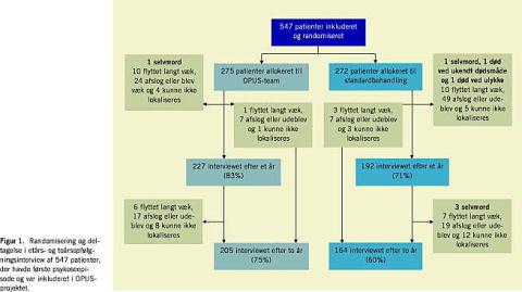 Materiale og metoder: I perioden 1998-2000 blev 547 patienter i alderen 18-45 år med debuterende psykose i H:S-området og Århus Amt inkluderet i en randomiseret klinisk undersøgelse af integreret behandling (OPUS-team) over for standardbehandling. Behandlingen i OPUS-team var af to års varighed og indeholdt tilknytning til en fast kontaktperson, inddragelse af familien og tilbud om træning af sociale færdigheder. Standardbehandlingen bestod oftest i tilbud om kontakt til et distriktspsykiatrisk center.