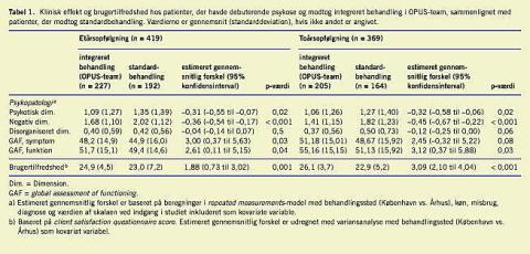 Integreret behandling i OPUS-team var signifikant bedre end standardbehandlingen med hensyn til effekten på psykotiske symptomer og negative symptomer (Tabel 1).