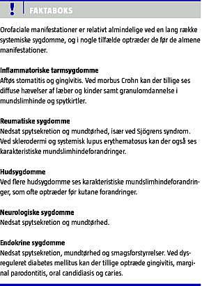 Summary Oral manifestations in systemic diseases Ugeskr Læger 2010;172(44):3033-3036 Systemic diseases may affect the oral tissues, i.e. oral mucosa, salivary glands, teeth or bone, and oral manifestations will frequently present early, i.e. in association with (non-fulminant) systemic disease. Thus, recognition and proper diagnosis is essential to initiate appropriate treatment schedules. Key examples of systemic disease groups with oral manifestations include dermatological, inflammatory connective tissue diseases, haematological and inflammatory gastrointestinal diseases, as well as neurological and endocrine diseases.