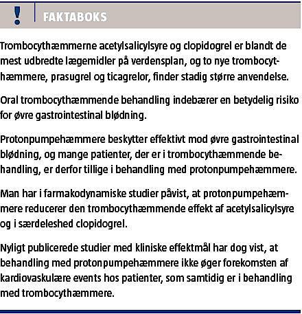 Orale trombocythæmmere og PPI er blandt de mest solgte lægemidler i verden [1]. Det er rimeligt at antage, at en farmakodynamisk interaktion mellem trombocythæmmere (især clopidogrel) og PPI eksisterer. Den kliniske betydning heraf synes dog at være beskeden og retfærdiggør ikke væsentlige ændringer af de nuværende rekommandationer for trombocythæmmende og syreneutraliserende behandling (Tabel 2). Det bør erindres, at den store udbredelse af disse farmaka indebærer, at selv svage interaktioner kan have store sundhedsmæssige implikationer.