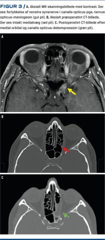En 45-årig mand havde aftagende syn på venstre øje gennem seks måneder. En øjenundersøgelse afslørede venstresidigt papilødem, venøs stase og nedsat visus til 0,5. En computerperimetriundersøgelse viste synsfeltspåvirkning i de temporale kvadranter. Der blev foranlediget en MR-skanning, som viste en fortykkelse af venstre synsnerve (Figur 3), hvilket var radiologisk foreneligt med et nervus opticus-meningeom beliggende i canalis opticus. Pga. det formodede meningeoms lokalisation vurderedes det ikke at være muligt at fjerne selve meningeomet operativt. Da patienten havde et hastigt progredierende synstab, fandt man derimod indikation for ossøs dekompression af nerven ved en endoskopisk endonasal åbning af canalis opticus (Figur 3). Dagen efter dette indgreb kunne han udskrives til eget hjem. Umiddelbart postoperativt bemærkede han subjektiv synsbedring. Ca. en måned postoperativt havde han fortsat subjektiv bedring af synet. Dette blev bekræftet ved en oftalmologisk objektiv undersøgelse, hvor visus på venstre side var fuldt normaliseret fra oprindelige 0,5 til 1,0. Desuden var synsfeltsdefekten aftagende med mean deviation fra –4,45 dB til –3,4 dB. Han blev efterfølgende fulgt med regelmæssige skanninger og øjenundersøgelser.