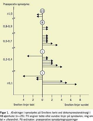 Den samlede spændvidde i præoperativt optimalt korrigeret visus var 0,1-1,25. Synsresultaterne fremgår af Figur1 . I alt 36 berørte øjne forblev stort set uændrede: 23 havde helt samme visus, mens ti øjne ved operationen vandt 2-7 linjer på Snellens synstavle. De sidste to øjne gik 3-4 linjer ned. Den ene patient havde visus 0,7 og 0,16 præoperativt. Højre øje steg til 0,9, mens venstre senere frembød synsnerveatrofi og visus 1/36. Den anden patient med signifikant synstab var en 45-årig mentalt retarderet kvinde. Vi noterede synstab på højre øje fra 0,25 til 1/24, mens venstre øje steg fra 1/60 til 0,4. Efterundersøgelsen afslørede klinisk recidiv af aktiv TAO, og revision af dekompressionsoperationen blev tilbudt.