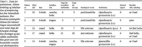 En 17-årig ung mand fik foretaget en transkartilaginøs piercing opadtil i helix. Han fik derefter hævelse, rødme og sekretion fra øret efter tre døgn. Da infektionen forværredes over en uge, blev piercingringen fjernet. Patienten henvendte sig til en alment praktiserende læge efter 14 dage og fik en uges penicillinbehandling. Da symptomerne forværredes med smerter og hævelse, blev patienten indlagt på øre-næse-hals-afdelingen.