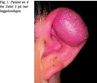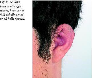 Ved undersøgelsen fandtes en massiv fluktuerende ansamling på ørets helix, der var udtalt øm og med rødme, som bredte sig retroaurikulært (Fig. 1 ). Abscessen blev incideret bag øret i lokalanalgesi og i rus. Der udtømtes store mængder pus, og brusken var borteroderet i hele helix. Patienten fik intravenøst indgivet antibiotika med ciproxin og gentamycin, og kaviteten blev renset dagligt med eddikesur lerjordsopløsning 0,8% under de følgende fem dages indlæggelse. Øret fik et pænt kosmetisk resultat fraset affladning af helixkanten opadtil (Fig. 2 ).