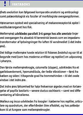 Summary Evolution of the ear Ugeskr Læger 2009;171(51):3780-3784 The evolution of the ear may be traced through transitional fossils, comparative anatomy and embryology. The organ of hearing evolved from receptors of the vestibulary organ of fish. The tympanic ear developed in amphibians at the transition to terrestrial life, and the hyomandibula was isolated as the first middle ear bone, the columella stapes. Reptile jaw bones, quadratum and articulare, transformed to malleus and incus in mammals. With selective advantages during the evolution, an increasing structural complexity of the ear accompanied improved sound transmission and reception.