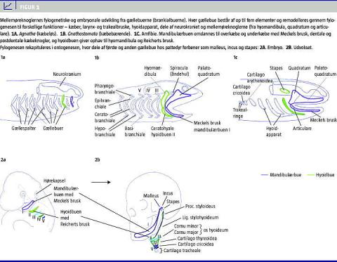 Embryologien af øreregionen røber sit ophav, idet evolutionen og fylogenesen i nogen grad rekapituleres i ontogenesen (Figur 2 ); mandibulærbuen (Meckels brusk) giver ophav til dentale og de postdentale kæbeknogler [14]. Hos pattedyr forbener den anteriore del som mandibula, og den posteriore del som annulus tympanicus, malleus og incus [3, 5, 6, 16, 18]. Man kan ligeledes spore hyoidbuen (Reicherts brusk), der superiort forbener som stapes.