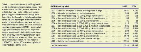 Implementeringen af den danske diagnoserelateret gruppe (DRG)-model og Sundhedsstyrelsens service »sundshedsstatistik« giver mulighed for at få et indtryk af aktiviteten [8]. I 2004 blev der født 64.670 børn i Danmark og 22.497 af disse blev udskrevet med en DRG-kode (Tabel 1 ). En stor del af udskrivelserne i koderne 1501, 1502, 1508, 1511, og 1513 var fra obstetriske afdelinger. Det drejede sig om børn, som har frembudt problemer kort efter fødslen, som måske har haft behov for måling af blodsukker, bilirubin eller kontrol af pH efter fødslen, og som formentlig har været tilset af en pædiater. Kode 1501 (død eller udskrevet til anden afdeling inden for to døgn) steg alene fra 2.851 til 7.143 børn fra 2003 til 2004. Det totale antal børn, der døde i første leveuge er omkring 200. Stigningen tyder mest på usikkerhed i kodningen.