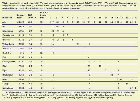 For at få et indtryk af fordelingen af den intensive behandlingsaktivitet i Danmark er det totale antal af børn med disse tre koder tabuleret for bopælsamt og behandlingshospital i Tabel 2 . Der var i alt 663 forløb i 2004, hvilket svarer til 1% af samtlige nyfødte. Af disse stod Rigshospitalet, Odense Universitetshospital og Skejby Sygehus for 394 (59%), heraf havde 238 børn bopæl uden for de respektive amter. De øvrige amter benyttede sig af disse tre hospitaler i varierende grad.