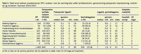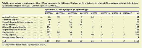 Resultater: Der blev i perioden 2004-2007 udført 1.469 radikale prostatektomier på ni afdelinger faldende til seks afdelinger i 2007. Aktiviteten steg fra 349 indgreb i 2004 til 554 indgreb i 2006. Ca. 75% af operationerne var kodet som »simpel« radikal prostatektomi (KKEC00) uden skelen til nervebesparende teknik. Den mediane postoperative indlæggelsestid var fire dage med et gennemsnit på 5,1 dage. Mortaliteten var 0,2%. På to afdelinger udførte man > 90% af de 87 registrerede laparoskopiske indgreb.