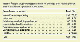 I forbindelse med ca. halvdelen af indgrebene (841) blev der tillige foretaget lymfadenektomi og derfor kodet for excision af de iliakale lymfeknuder. Resultatet heraf afspejler store forskelle i frekvensen af udførte excisioner de enkelte afdelinger imellem (Tabel 3). Antallet og den procentuelle andel (8-97%) af genindlæggelser findes i Tabel 3, ligeledes med meget store forskelle imellem afdelingerne. Imidlertid afspejles dette forhold ikke i den samlede postoperative liggetid. Denne er nogenlunde ens på de involverede afdelinger, og er som medianværdi fire dage med spredningen 3-6 dage. Disse data dækker over enkelte meget lange postoperative indlæggelsesforløb (maksimalt: 6-99 dage). I alt tre (0,2%) patienter døde inden for 30 dage postoperativt, heraf en enkelt efter kortvarig udskrivelse. Kodningen af aktionsdiagnoserne i forbindelse med genindlæggelser efter RP er yderst mangfoldig - de i alt 665 »genindlæggelser« fordeles således på ikke mindre end 80 forskellige årsagsdiagnoser. Disse kan dog samles i noget færre overordnede grupper (Tabel 4). Blandt disse udgøres ca. 73% af indlæggelserne af hospitaliseringen i forbindelse med kateterseponeringen få uger postoperativt. Blandt årsagerne til de egentlige genindlæggelser udgør infektionsproblematik knap 10%, spændende fra overfladisk sårinfektion til septisk shock. Kateterproblemer, vandladningsgener og blødning var samlet årsag til ca. 7% af genindlæggelserne. I forbindelse med aktionsdiagnoserne er der ikke differentieret imellem de opererende afdelinger.