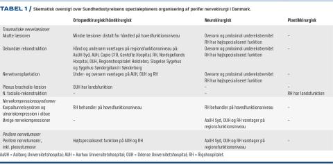 I henhold til specialeplanen for neurokirurgi 2018 behandles nervekompressionsyndromer med regionsfunktion på hhv. Rigshospitalet, Aalborg Universitetshospital og Odense Universitetshospital. Excision af patologisk væv, primært tumorer, udgående fra perifere nerver og plexus brachialis behandles på højtspecialiseret niveau på samme hospitaler. Læsioner på overarme og proksimalt på underekstremiteter på højtspecialiseret niveau behandles på Rigshospitalet [16]. Ekstrakraniel mikrorekonstruktion af n. facialis er en højtspecialiseret funktion, der varetages på Plastikkirurgisk Afdeling på Rigshospitalet [17] (Tabel 1).