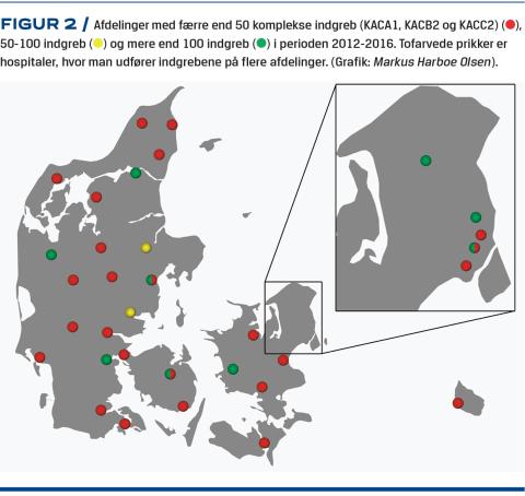 Et udtræk fra Landspatientregisteret over alle indgreb på perifere nerver (SKS-kode KAC) foretaget på offentlige og private hospitaler i Danmark i perioden 2012-2016 viser, at man på mere end 60 afdelinger i Danmark har udført indgreb på perifere nerver. Mere kompleks nervekirurgi (nervesutur, eksploration af perifer nerve, rekonstruktion af nerve) er udført på 49 forskellige afdelinger (Figur 1). På to af disse afdelinger har man udført 50-100 indgreb (10-20 årligt). På ni afdelinger har man udført mere end 100 indgreb (20 årligt). Rekonstruktion af perifer nerve (KACC2) er udført på 25 afdelinger, hvoraf kun tre afdelinger har udført indgrebet mere end fem gange over fem år (Figur 2).