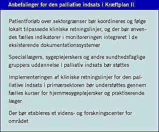 Kræftplan II fra 2005 [6] indeholder anbefalinger for behandling, uddannelse, udvikling og forskning inden for den palliative indsats, der dog ikke er blevet prioriteret politisk. Argumentet har været, at man med hospicepuljen havde sikret den palliative indsats. Denne politiske prioritering har medført, at der i de seneste år er skudt hospicer op mange steder, og sideløbende er der opstået et stort udækket behov for specialuddannet personale inden for palliativ indsats. Der er tiltagende behov for udvikling af kliniske og organisatoriske retningslinjer, således at kvaliteten af tilbuddene til patienter og pårørende på de forskellige institutioner bliver på et ensartet og højt niveau. I Kræftplan II anbefaler man bl.a., at den palliative indsats på sygehusene styrkes, og at der sættes fokus på at optimere de palliative patienters indlæggelsesforløb.