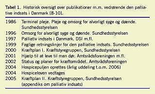 For en nærmere beskrivelse henvises til Dansk selskab for almen medicins (DSAM) kliniske vejledning fra 2004 »Palliation i primærsektoren« [7] og Sundhedsstyrelsens retningslinjer fra 1999 [8] (Tabel 1 ).