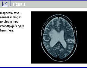 Patienten blev overflyttet til Neurologisk Afdeling for at udelukke anden organisk sygdom. Klinisk fandtes ingen tegn på ny apopleksi og computertomografier var uden tegn på nye infarkter. Elektroencefalogram (EEG) udelukkede nonkonvulsiv status epilepticus. Forløbet blev kompliceret af pneumoni, som responderede på antibiotika. Da Psykiatrisk Afdeling fortsat fandt tilstanden uforklaret, blev der suppleret med magnetisk resonans-skanning af cerebrum, der bekræftede de computertomografiske fund (Figur 1 ). Lumbalpunktur udelukkede encephalitis og kontrol-EEG var normalt.