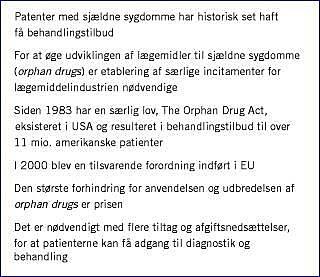 Maroteaux-Lamys syndrom, Fabrys sygdom og Lennox-Gastauts syndrom er nogle af mere end 5.000 sjældne sygdomme og tilstande defineret som sygdomme med prævalens på færre end en ud af 2.000 mennesker [1]. Sjældne sygdomme er forbundet med væsentlige medicinske og menneskelige konsekvenser, idet en korrekt diagnose ofte stilles sent, og behandlerekspertisen er spredt. Internationalt anvendes betegnelsen orphan drugs (OD) for lægemidler til behandling af sjældne sygdomme. Lægemiddelindustrien (LI) har traditionelt udviklet få OD, da udgifter til forskning og udvikling ofte ikke dækkes som følge af markedets begrænsede størrelse. Konsekvensen er langvarige udrednings- og behandlingsforløb samt øget morbiditet og mortalitet. For at tilbyde patienter med sjældne sygdomme adgang til kvalificeret diagnostik og behandling er det bl.a. afgørende, at LI får yderligere incitamenter til forskning, udvikling og markedsføring af egnede lægemidler [2].