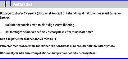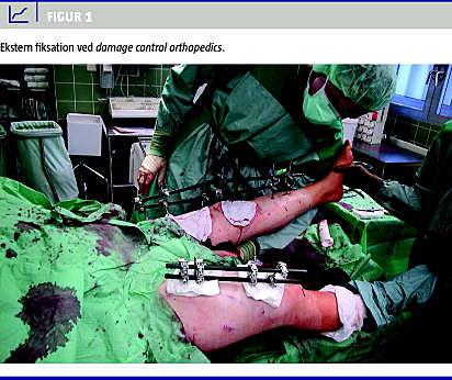 Summary Orthopedic surgical aspects of damage control surgery Ugeskr Læger 2011;173(18):1273-1276 Damage control orthopedics (DCO) is a concept for treatment of fractures in severely injured patients. The fractures are stabilized with external fixators instead of primary definitive osteosynthesis, known as early total care (ETC). The purpose of DCO is to minimize time of surgery and bleeding and thereby minimize the "second hit". Not all patients require DCO, patients with stable vital functions can safely be treated with primary definitive osteosynthesis, DCO is, however, a safe method that can be used, when shorter time of surgery is desirable or a systemic immune response is imminent.
