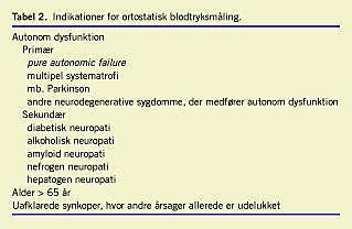 Nærmere udredning for ortostatisk hypotension anbefales ved recidiverende synkoper og nærsynkoper eller fald hos patienter, der opfylder de i Tabel 2 anførte indikationer.